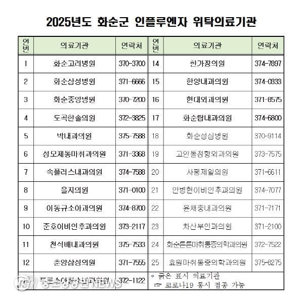 화순군은 65세 이상 어르신을 대상으로 2025~2026 절기 인플루엔자(독감) · 코로나19 무료 예방접종을 실시한다고 21일 밝혔다.