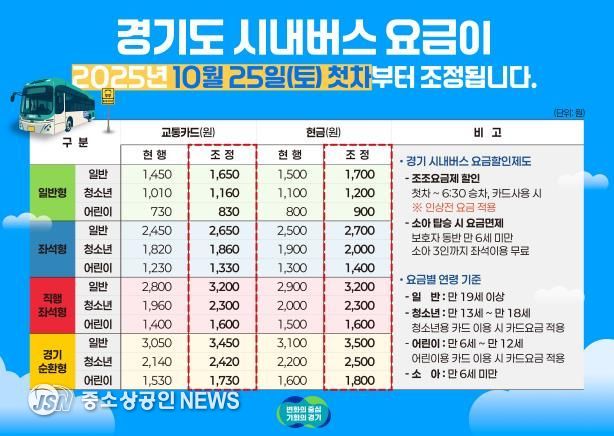 시내버스 요금 조정은 2019년 9월 이후 6년 만으로 일반형·좌석형은 각 200원, 직행좌석형·경기순환형은 각 400원 인상한다.