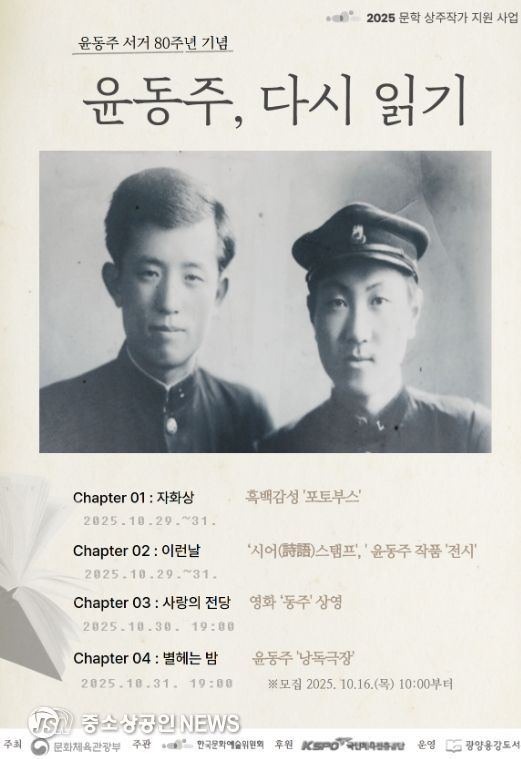 광양용강도서관이 윤동주 서거 80주년을 맞아 오는 10월 29일부터 31일까지 그의 삶과 작품세계를 다양한 방식으로 조명하는 프로그램 '윤동주, 다시 읽기'를 운영한다.