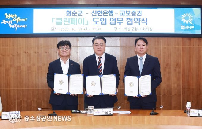 화순군은 공정한 계약 문화 정착과 원활한 대금·임금 지급을 위해 신한은행, 교보증권과 차세대 전자적대금지급 시스템인 ‘클린페이’ 도입을 위한 업무협약을 체결했다고 밝혔다.