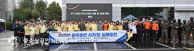 대구 남구는 지난 22일, KT 남대구지사 주차장에서 테러범에 의한 인질극 발생을 가정한 인질 구출, 테러범 진압 훈련 및 드론 테러에 의한 화재발생 시 대피훈련, 화재진압, 복구 작업 등 테러·화재 대비를 주제로 한 『2025 충무훈련 실제훈련』을 실시했다.