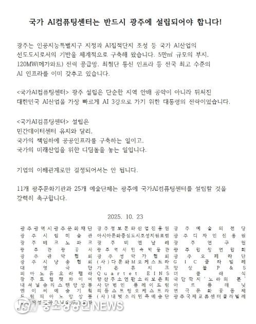 광주문화재단을 비롯한 11개 문화기관과 26개 예술단체는 공동 입장문을 통해 “광주는 인공지능특별지구 지정과 AI집적단지 조성 등 국가 AI산업의 선도도시로서의 기반을 체계적으로 구축해왔다”며 “국가AI컴퓨팅센터 설립은 단순한 지역 안배가 아닌, 대한민국이 AI 3강으로 도약하기 위한 대통령의 전략적 결단”이라고 밝혔다.