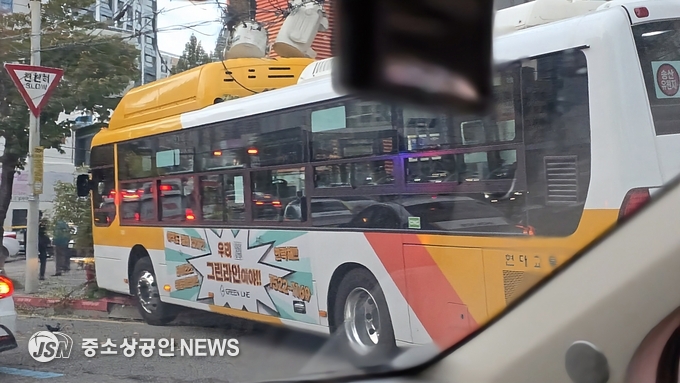 [30일 오후 광주 서구 서구청 앞 도로에서 시내버스가 가로수와 전봇대를 잇따라 들이받은 뒤 인도 위로 올라가 멈춰 서 있다.] (사진=중소상공인뉴스)
