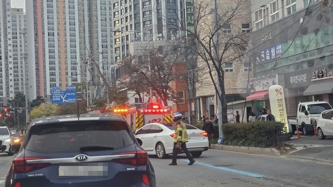 [광주 서구청 앞 버스 사고로 도로 일부가 통제돼 차량이 정체되고 있다.] (사진=중소상공인뉴스)