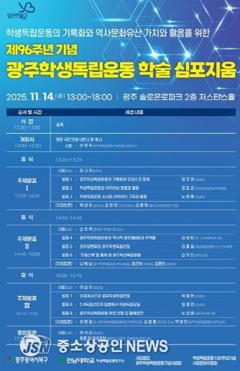 광주광역시 북구가 오는 14일 광주 솔로몬로파크 저스티스홀에서 ‘학생독립운동 96주년 기념 학술 심포지엄’을 개최한다고 13일 밝혔다.