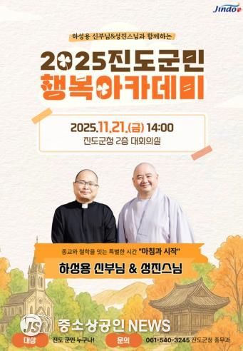 진도군은 오는 21일 오후 2시에 진도군청 대회의실에서 하성용 신부와 성진 스님을 초청해 올해의 마지막 ‘진도 군민행복 아카데미’ 강연을 개최한다.