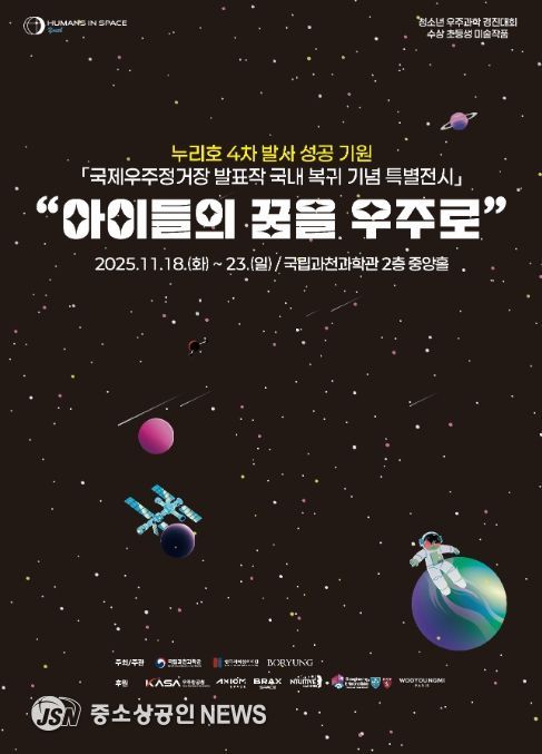 과학기술정보통신부 국립과천과학관은 11월 27일로 예정된 누리호 4차 발사 성공을 기원하며, 11월 18일부터 23일까지 다양한 전시와 체험으로 구성된 특별 프로그램을 개최한다. 이번 행사는 국제우주정거장(ISS)에 소개된 초등생 미술 작품을 국내 최초로 선보이고, 실물 크기의 누리호 기립 작동을 포함한 다채로운 우주과학 체험을 통해 국민과 함께 발사 성공을 응원하는 취지로 마련됐다.