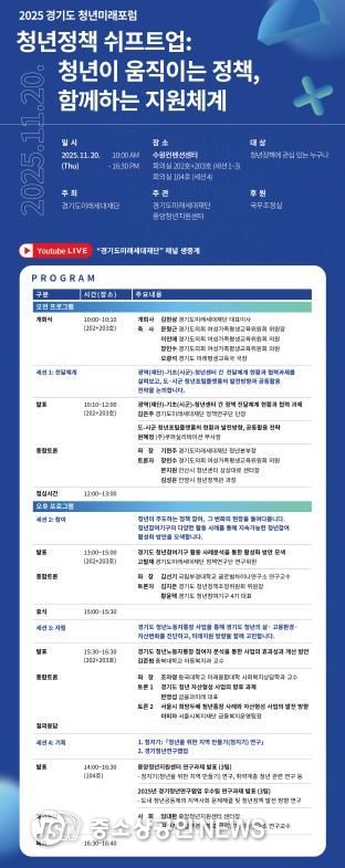 이날 포럼은 오전 10시부터 오후 4시 30분까지 진행되며, 청년정책에 관심 있는 누구나 참여할 수 있다. 수원컨벤션센터 202호, 203호, 104호 회의실에서 세션별로 열리며, 현장 참여 외에도 경기도미래세대재단 유튜브 채널을 통해 생중계로 시청할 수 있다.