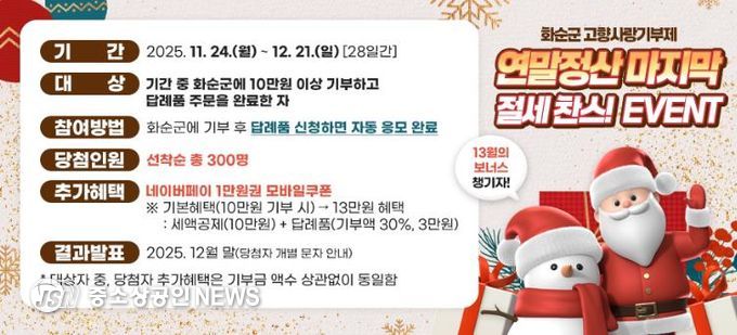 화순군은 연말을 맞아 고향사랑기부제 ‘연말정산 마지막 절세 찬스!’ 이벤트를 오는 11월 24일부터 12월 21일까지(28일간) 진행한다고 밝혔다.