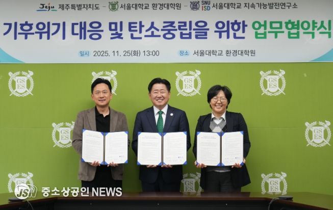 제주도는 25일 오전 서울대학교에서 서울대 환경대학원, 지속가능발전연구소와 ‘기후위기 대응 및 탄소중립을 위한 지속가능 정책 연구·자문 및 교류 업무협약’을 체결했다.