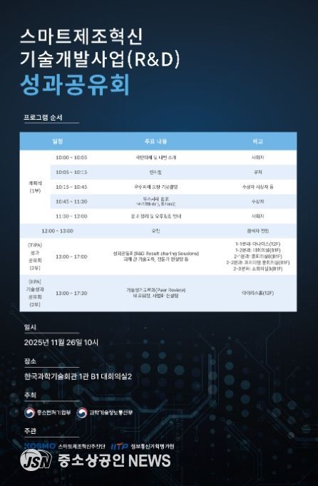 과학기술정보통신부는 중소벤처기업부와 함께 중소기업의 지능형 제조(스마트제조) 역량 고도화를 지원하기 위해 추진 중인 ‘지능형 제조(스마트제조) 혁신 기술 개발’ 사업의 성과를 공유하고, 제조 현장 확산을 위한 성과공유회를 11월 26일 한국과학기술회관에서 공동으로 개최할 예정이라고 밝혔다.