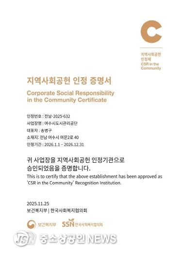여수시도시관리공단(이사장 송병구)은 보건복지부와 한국사회복지협의회가 공동 주관하는 ‘2025년 지역사회공헌 인정제’에서 최고등급인 S등급을 획득하며 4년 연속 지역사회공헌 인정기관으로 선정됐다고 26일 밝혔다.