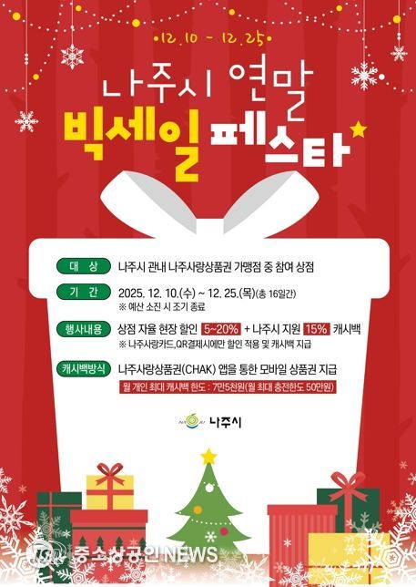나주시는 연말을 맞아 지역 경제 활성화와 골목상권 지원을 위한 ‘연말 빅세일페스타’를 개최한다고 27일 밝혔다.