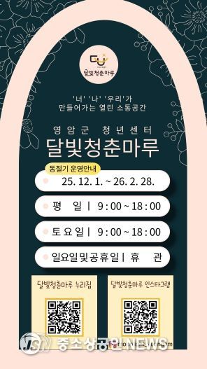 김선미 영암군 인구청년과장은 “청년들이 안전하게 달빛청춘마루를 이용할 수 있도록 부득이하게 겨울철 운영 시간을 줄이게 됐다. 내년 3월부터는 다시 야간 운영을 재개해 청년 활동을 지원하겠다”고 밝혔다.