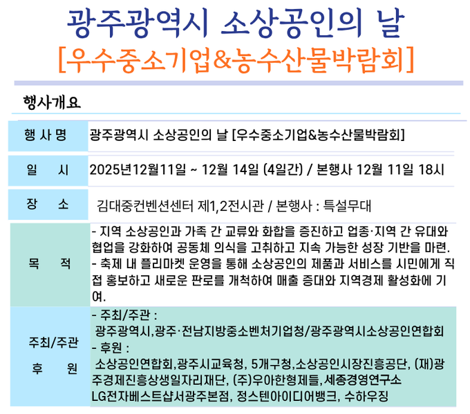 광주광역시 소상공인연합회(회장 이기성)는 지역 소상공인의 판로 확대와 지역경제 활성화를 위해 오는 2025년 12월 11일부터 14일까지 김대중컨벤션센터 제1·2전시관에서 ‘광주광역시 소상공인의 날[우수중소기업 & 농수산물 박람회]’를 개최한다. 이번 행사는 11일 오후 6시에 열리는 본행사를 시작으로 4일간 진행되며, 지역 소상공인과 중소기업, 농·수산업 종사자들이 한곳에 모여 제품을 소개하고 시민과 직접 교류할 수 있는 자리를 마련한다.