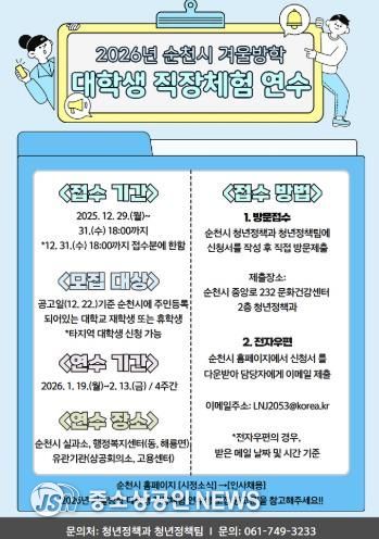 순천시는 겨울방학을 맞아 대학생들에게 행정 현장 경험의 기회를 제공하기 위해 ‘2026년 겨울방학 대학생 직장체험 연수생’을 모집한다고 밝혔다.