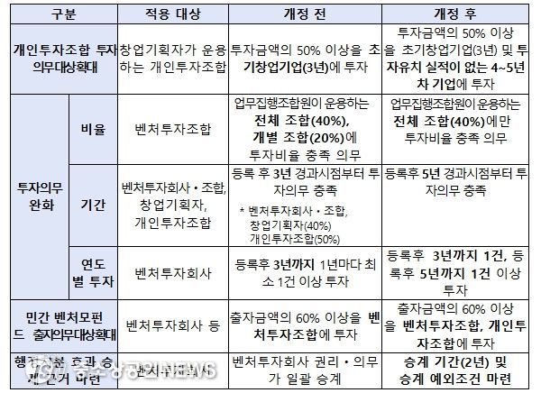 이를 통해 시장 상황을 반영하여 보다 유연한 투자 전략 수립이 가능해질 전망이다. 특히 초기투자 생태계의 주축을 이루는 개인투자조합과 창업 기획자의 활동 반경이 한층 넓어질 것으로 기대된다.