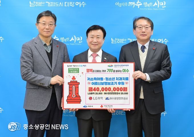 여수시는 LG화학 여수공장(주재임원 이현규)과 여수광양항만공사(사장직무대행 황학범)가 지난 23일 저소득 아동·청소년 치과치료 지원사업과 노인 보행 보조기 지원사업 추진을 위해 2천만 원씩 총 4천만 원을 후원하는 증서를 전달했다고 밝혔다.