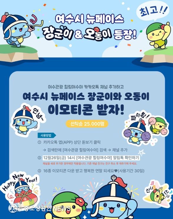 여수시가 새롭게 리뉴얼된 마스코트 ‘장군이·오동이’ 카카오톡 이모티콘을 오는 26일 오후 2시부터 선착순 2만 5천 명에게 무료로 배포한다고 밝혔다.