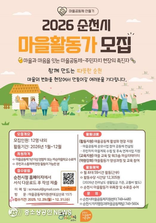 순천시는 마을공동체 만들기 공모사업의 원활한 추진과 주민자치·마을공동체 활성화 등 따뜻한 순천을 함께 만들어갈 2026년 마을활동가 12명을 모집한다고 밝혔다.