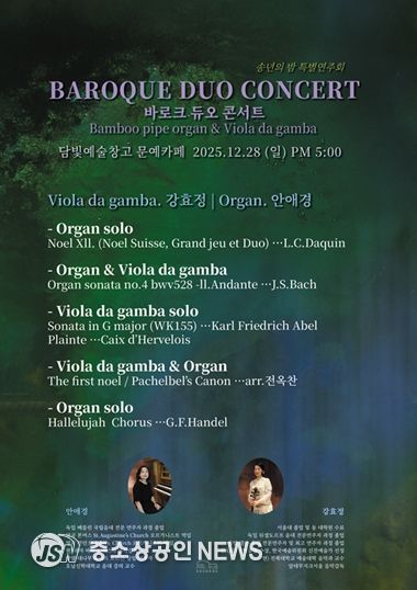 담양군문화재단은 오는 28일 오후 5시 담빛예술창고 문예카페에서 『2025 담빛예술창고 송년특별연주회 ‘바로크 듀오 콘서트’』를 진행한다고 밝혔다.