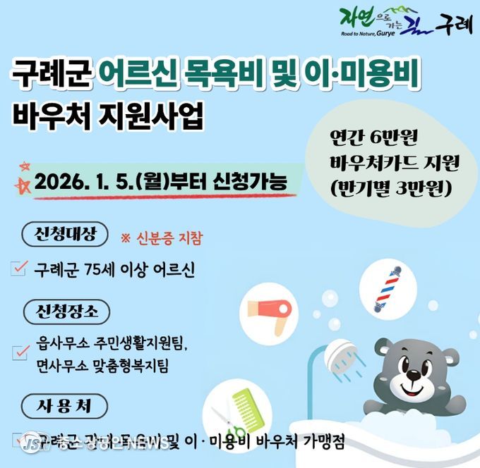 구례군은 75세 이상 어르신들의 건강하고 활기찬 노후생활 보장과 지역경제 활성화를 도모하기 위해 '어르신 목욕비 및 이·미용비 바우처 지원사업'을 본격 추진한다고 밝혔다.