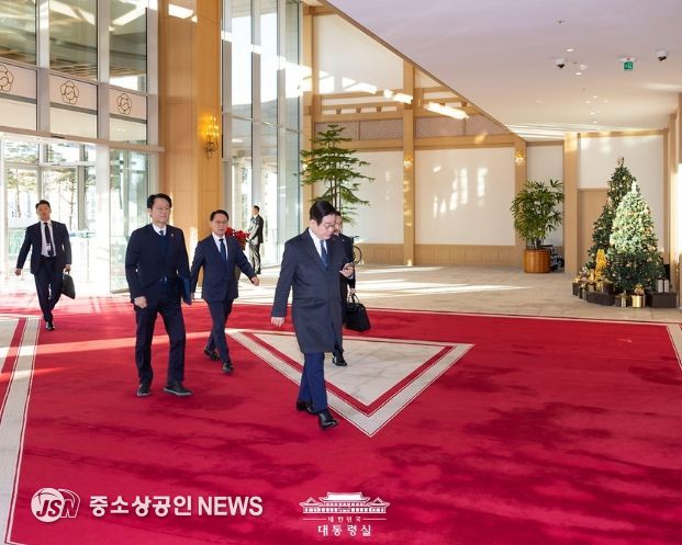이재명 대통령이 26일 청와대 복귀를 앞두고 용산 대통령실로 마지막 출근을 하고 있다.