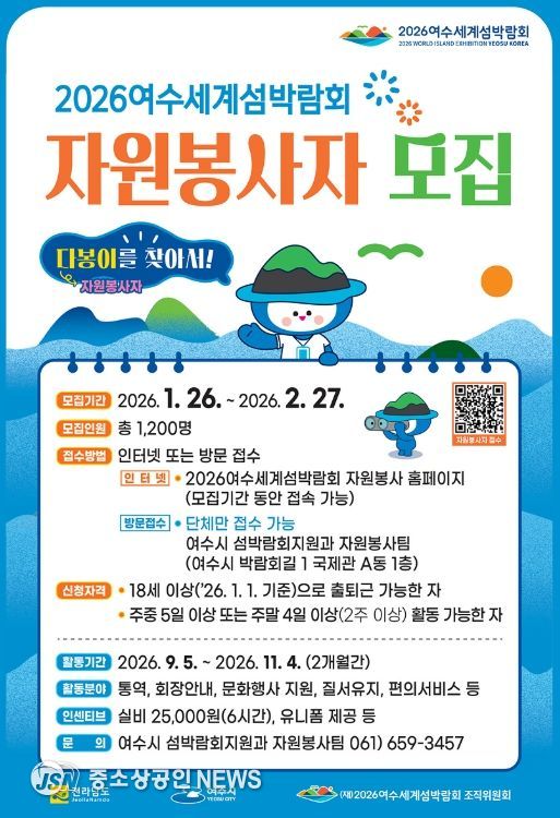 한편, 2026여수세계섬박람회는 ‘섬, 바다와 미래를 잇다’를 주제로 돌산 진모지구 일원에서 개최될 예정이며, 시는 섬박람회에 함께할 자원봉사자를 오는 2026년 1월 26일부터 2월 27일까지 모집한다.