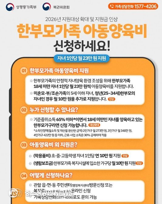 - 한부모가족의 안정적 자녀양육 환경 조성을 위해 한부모가족 18세 미만 자녀 1인당 월 23만 원씩 아동양육비를 지원합니다.