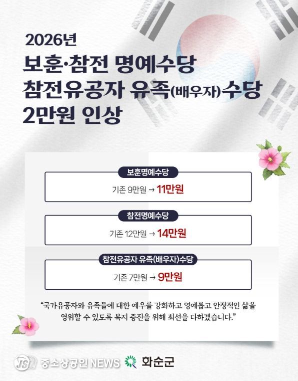 화순군은 2026년 1월부터 국가보훈대상자와 유족에 대한 예우를 한층 강화하기 위해 보훈 관련 수당을 월 2만 원씩 인상한다고 밝혔다.