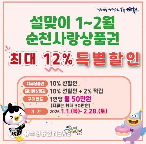 순천시가 새해와 설 명절을 맞아 2026년 1월부터 2월까지 두 달간 순천사랑상품권 할인 행사를 추진해 지역 소비 촉진에 나선다고 밝혔다.