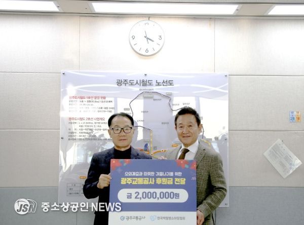 광주교통공사가 최근 광주시 서구 마륵동 본사에서 (사)한국 백혈병소아암협회 광주전남지회에 임직원들이 정성으로 모은 성금 200만 원을 전달하며 환아들의 따뜻한 연말연시를 기원했다.