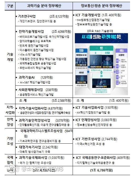 이번 종합시행계획은 2026년의 과기정통부 연구개발사업의 전반적인 추진방향과 분야별 추진계획을 확정하기 위해 수립됐다. 과학기술 분야 연구개발 예산 6조 4,402억원 및 정보통신‧방송(ICT) 분야 연구개발 예산 1조 6,786억원을 대상으로 하며, 지원 예산은 전년대비 약 25.4% 증가했다.