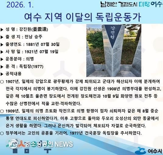 여수시는 2026년 1월의 독립운동가로 전라남도 승주 출신의 ‘강진원(姜震遠)’ 선생을 선정했다.