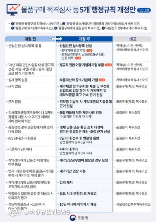 조달청은 안전한 노동환경 조성과 노동자의 고용안정, 부품 국산화 등 국정과제 이행을 지원하기 위해 ‘물품구매 적격심사 세부기준’을 포함한 5개 행정규칙을 개정하여 1월 1일부터 시행했다고 밝혔다.