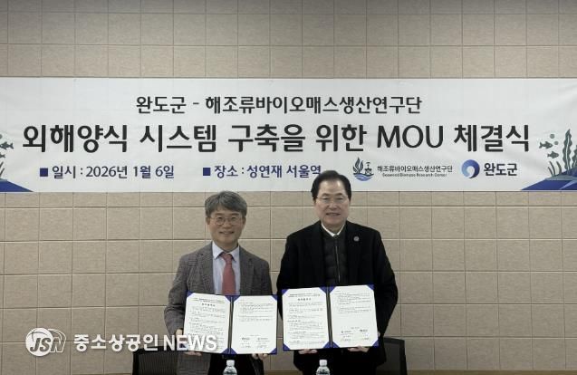 이에 완도군은 지난 6일 서울스퀘어에서 사업 용역을 맡은 해조류 바이오매스 생산연구단(단장 윤환수 성균관대학교 교수)과 해조류 외해 양식 테스트 베드(Test Bed) 구축 및 운영, 기술 협력·교류에 관한 업무 협약을 체결했다.