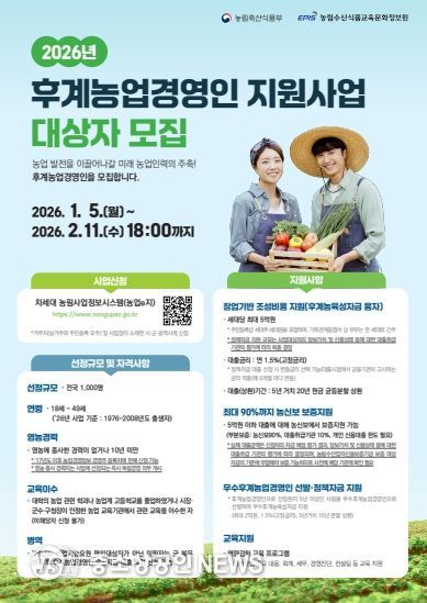 군 관계자는 “이번 후계농업경영인 육성사업은 젊고 유능한 인재들이 안정적으로 농업을 시작하고 성장할 수 있는 중요한 기회”라며, “미래 농업을 이끌어갈 예비 농업인들의 많은 관심과 참여를 바란다”고 말했다.