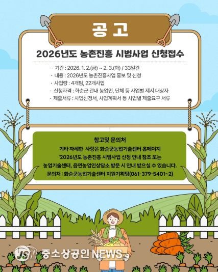 화순군은 “소득이 높은 부유 농촌” 실현과 화순 농업 경쟁력 강화를 위해 ‘2026년도 농촌진흥 시범사업’ 신청을 2026년 2월 3일까지 신청받는다고 밝혔다.