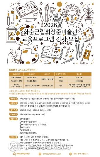 화순군은 화순군립최상준미술관(화순읍 동구리에 위치)에서 2026년 미술 교육 프로그램을 함께 운영할 전문 강사를 1월 9일부터 1월 16일까지 모집한다고 밝혔다.