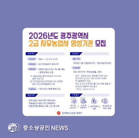 광주광역시 농업기술센터는 12일부터 30일까지 ‘2급 치유농업사 양성기관’ 지정을 위한 신청을 받는다.