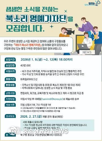 문인 북구청장은 “북소리 명예기자단은 주민이 직접 지역의 변화와 일상을 전하는 메신저인 만큼 이번 모집에 많은 관심과 참여를 바란다”며 “앞으로도 북소리가 주민과 행정의 소통 창구 역할을 할 수 있도록 다양한 지원을 아끼지 않겠다”고 말했다.