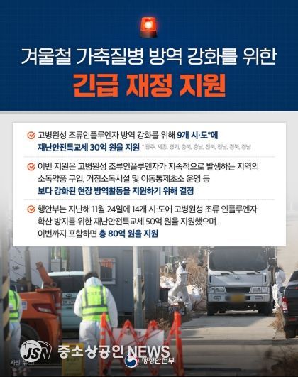 - 행안부는 지난해 11월 24일에 14개 시·도에 고병원성 조류인플루엔자 확산 방지를 위한 재난안전특교세 50억 원을 지원했으며 이번까지 포함하면 총 80억 원을 지원