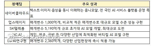 `25년 8월부터 「독자 AI 파운데이션 모델 프로젝트」 정예팀에 선발된 5개 팀이 치열한 경쟁을 통해 기술 혁신을 거듭한 결과, 정예팀이 개발한 AI 파운데이션 모델(`25년말 공개) 5개 모두 미국 비영리 AI연구기관 ‘Epoch AI’의 ‘주목할만한 AI모델(Notable AI Models)’로 등재되는 성과를 거두었다.