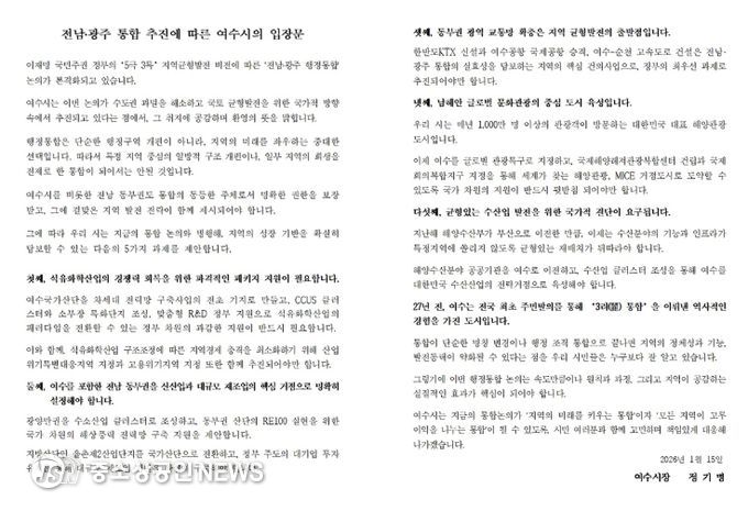 정 시장은 15일 입장문을 통해 “수도권 과밀 해소와 국토 균형발전을 위한 광주·전남 행정통합의 취지에 적극 공감하고 환영한다”며 “특정 지역 중심의 일방적 구조 개편이 아닌, 모든 지역이 고루 이익을 나누는 통합이 되어야 한다”라고 강조했다.