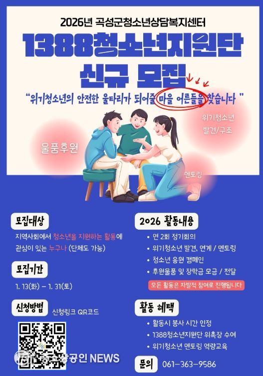 전남 곡성군은 관내 소재한 곡성군청소년상담복지센터에서 지역 내 위기청소년을 조기에 발견하고 실질적인 지원을 제공하기 위한 민·관 협력 조직인 ‘1388청소년지원단’의 2026년도 신규 단원을 모집한다고 16일 밝혔다.