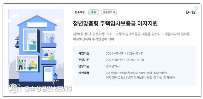 광주광역시는 무주택 청년의 주거비 부담 완화를 위한 청년맞춤형 주택임차보증금 이자지원 사업 대상자를 19일부터 모집한다.