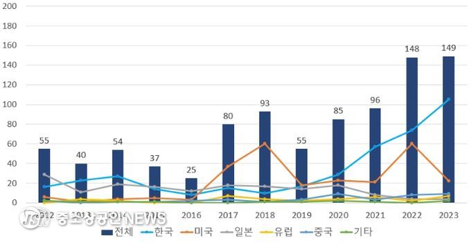 특히, 최근 3년 기준(2021~2023년) 삼성전자(139건)·SK하이닉스(86건)가 1위와 2위를 차지하여 한국이 전 세계 AI 메모리용 강유전체 소자의 연구개발을 주도하고 있음을 확인할 수 있었다.