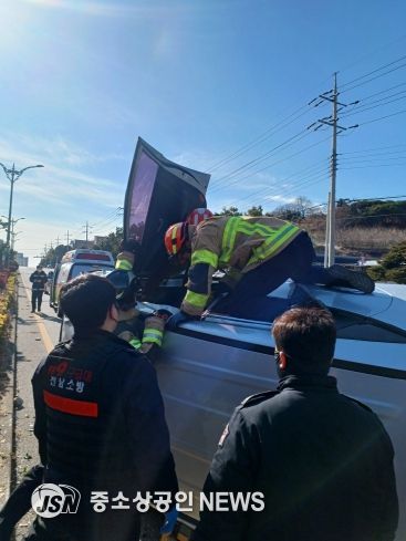 여수소방서는 1월 20일 오전 11시 30분경, 여수시 여천역 인근 도로상에서 발생한 교통사고 현장에서 신속한 구조활동을 펼쳐 요구조자 1명을 안전하게 구조했다고 밝혔다.