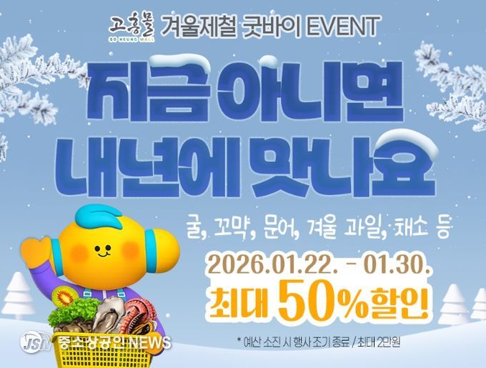고흥군이 운영하는 온라인 쇼핑몰 고흥몰은 1월 22일부터 30일까지 겨울 제철 농수산물을 최대 50% 할인하는 특별 기획전 ‘지금 아니면 내년에 맛나요’를 개최한다.