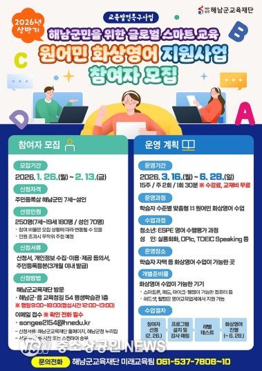 재단법인 해남군교육재단(이사장 명현관)은 상반기 원어민 화상영어 지원사업의 참여자를 모집한다. 지난 2023년부터 시작된 원어민 화상영어 지원사업은 군민 누구나 양질의 영어 교육을 받을 수 있도록 해 지역 내 교육 불균형을 해소하고, 미래 글로벌 인재 양성에 기여하기 위해 운영되고 있다.